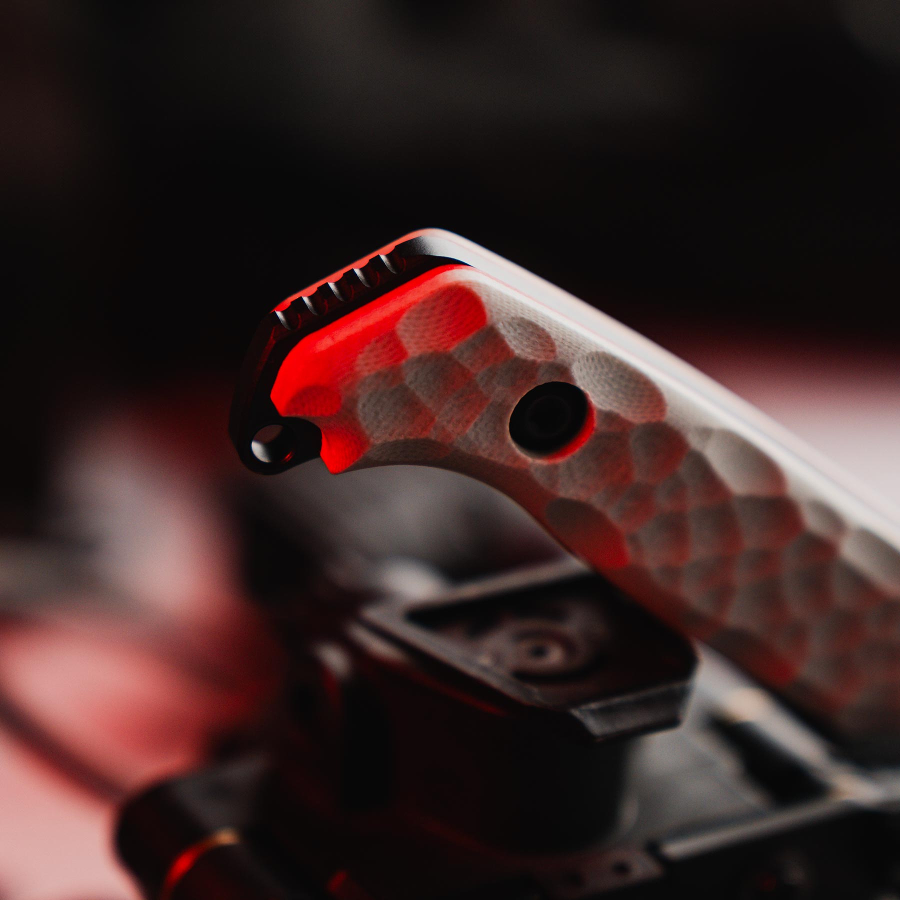 Highlights of The Darter Tanto include the now iconic reverse serrations on the spine, which offer an extremely sharp solution to fighting with the back of the knife. Additionally, the tanto blade shape provides strength and durability, and the sharp, angular tip is excellent for piercing through tough materials. Its Grey G10 handle with Red liner is machined with a texture to match the iconic Haley Strategic dragonfly wing pattern, while also offering excellent grip when wet.