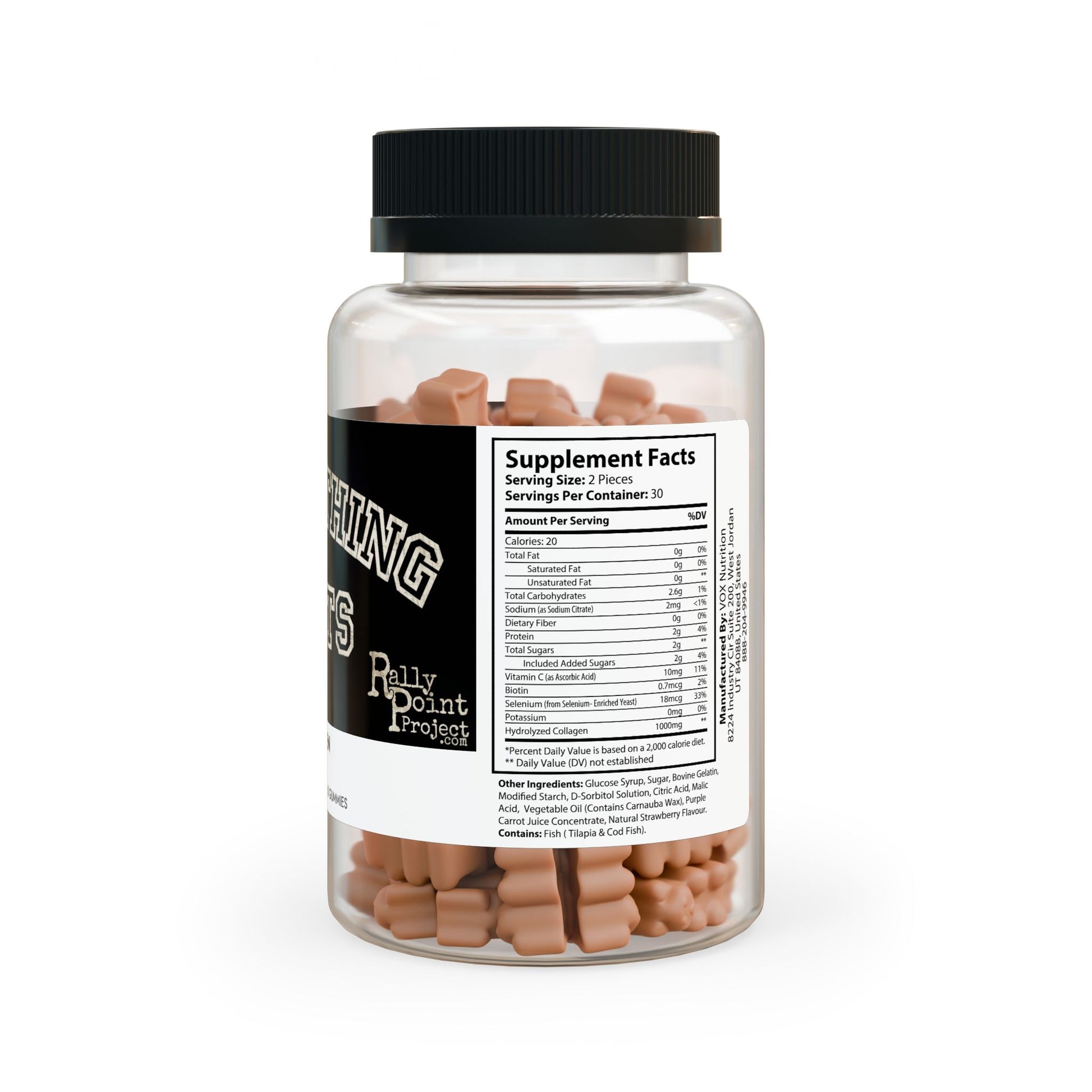 Ingredients: Sodium (as Sodium Citrate), Dietary Fiber, Protein, Included Added Sugars, Vitamin C (as Ascorbic Acid), Biotin, Selenium (from Selenium- Enriched Yeast), Potassium, Hydrolyzed Collagen. Other Ingredients: Glucose Syrup, Sugar, Bovine Gelatin, Modied Starch, D-Sorbitol Solution, Citric Acid, Malic Acid, Vegetable Oil (Contains Carnauba Wax), Purple Carrot Juice Concentrate, Natural Strawberry Flavour. Contains: Fish ( Tilapia & Cod Fish)