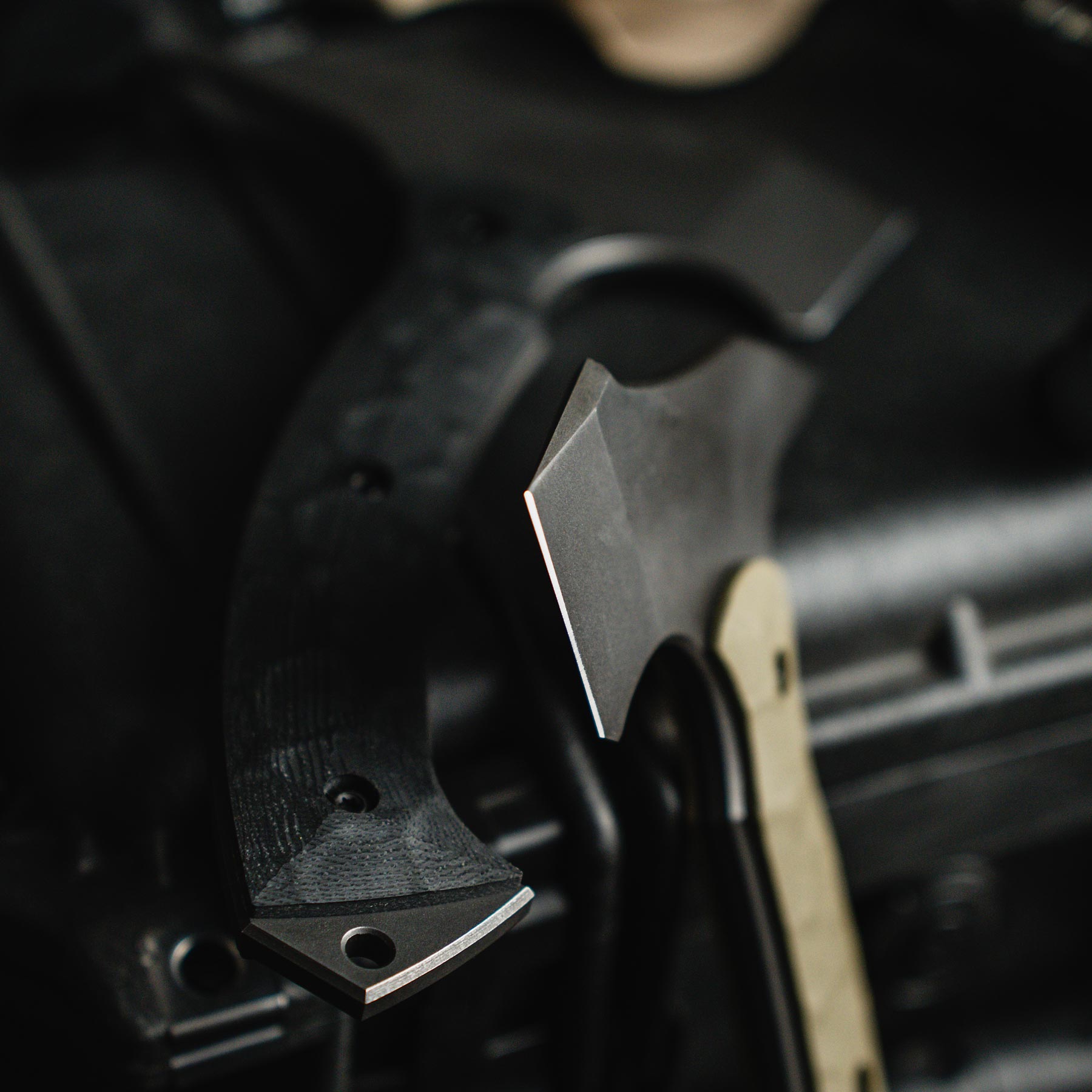 The F13 Tommy resembles traditional Native American Tomahawks, but we updated it with a tactical twist. Designed with a 90-degree point at the head of the axe, the F13 Tommy is the ideal breaching tool. The spike on the rear end of the axe head is extended to full tomahawk length giving the fingers plenty of room when striking with it. The 7.0” of handle length allows enough room for a two-handed grip, for increased swinging power, and the extremely durable G10 handle has a geometric texture carved into it for extra grip.